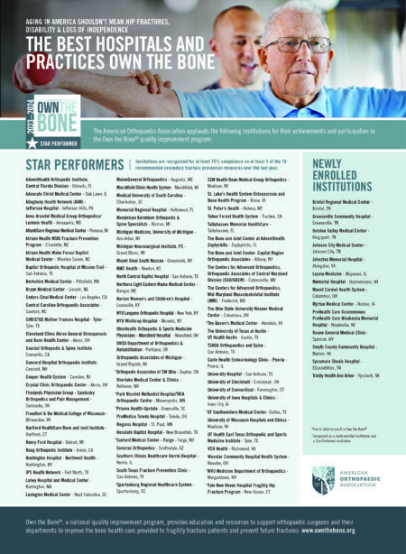 The American Orthopaedic Association regularly recognizes Own the Bone sites for their commitment to improving patient bone health after a fracture. Own the Bone enrolled hospitals and practices that achieve a 75% compliance rate with at least 5 of the 10 Own the Bone prevention measures, based on patients screened and entered into the registry during the preceding 12 month period, receive a special recognition as “Own the Bone Star Performers” in the annual recognition ad in U.S. News & World Report “Best Hospitals” Guide. Through their participation in Own the Bone and recognition as an Own the Bone Star Performer, institutions demonstrate a commitment to helping patients understand their risk for future fractures and the steps they can take to prevent them.